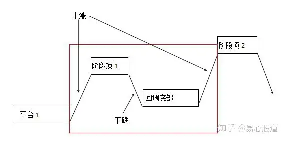 另外,所谓回调底部,其实就是从阶段顶部1下跌到平台1区间附近形成的底部。这个底部是动态测试的结果,所以这个底部有时比平台1的高点高,有时会在平台1的区间内,最差会与平台1底部持平。而上涨循环也是一环套一环的,在一般的情况下,回调底部的低点,不会低于前一个循环中的平台的低点。