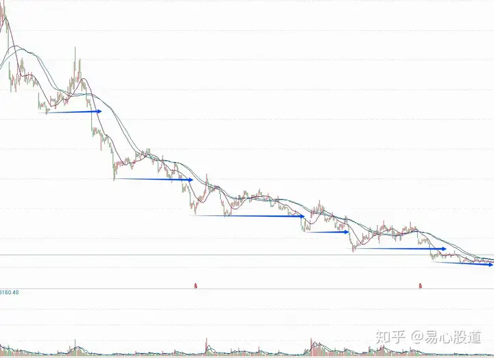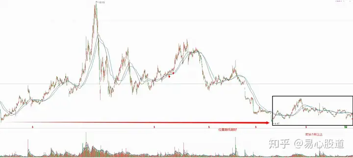 (2)从成交量看,是否在低位出现了持续的明显的低量。底部区域一般是下跌动能衰竭的地方。如果出现了放量长阴,那放量长阴最好位置越低越好(破平台下跌33%以上),而且是后面不再跌破为好。因为放量长阴如果不够低,即使其后止跌,往往也会被长阴压的抬不起头。
