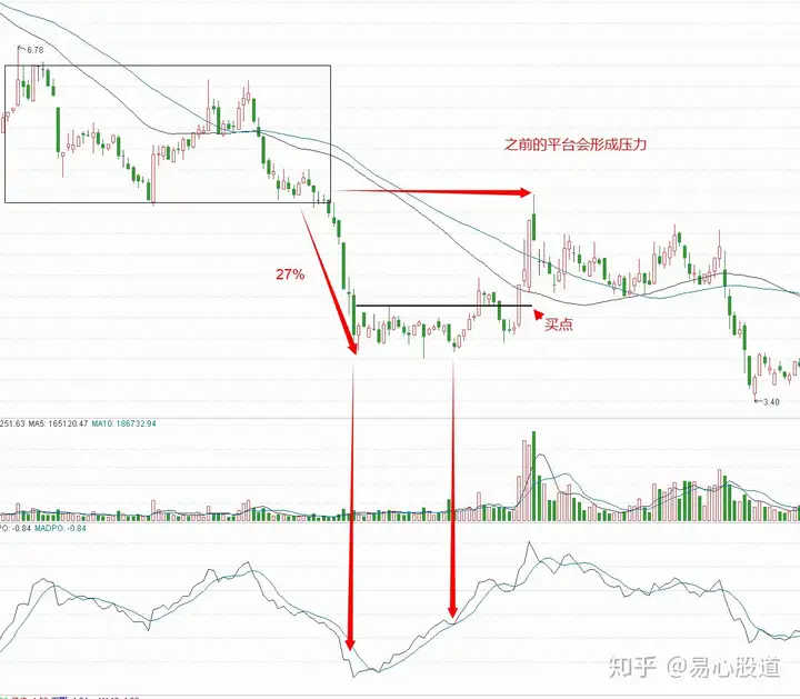 4,如何确定买点。如果上述几条均成立的条件下,破平台下跌的形成第一个底部会有一个小小的低量横盘区间,这个位置就是我们要的位置。以这个横盘区间的最高点为线。能够以合适的放量上攻过去即形成买点。但是一定要注意,在这第一买点的位置,放量最好不超过1.6倍,因为放量过高的话,就证明这个位置抛压严重。不过大多数情况下,在第3点的位置条件成熟的基础上,很少会在初步上攻时就放很大的量。