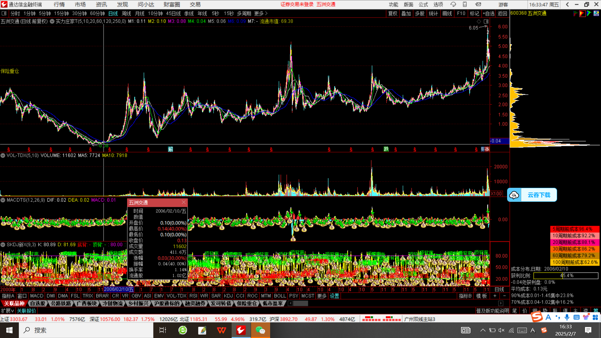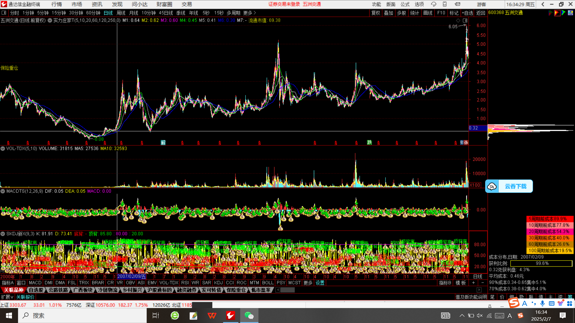 2,在五洲交通上市后第一波涨势前,MACD金叉后,股价在五季线上震荡一两个季度,此时调整到日线观察,发现筹码是集中的,买入,抓主升浪概率大。